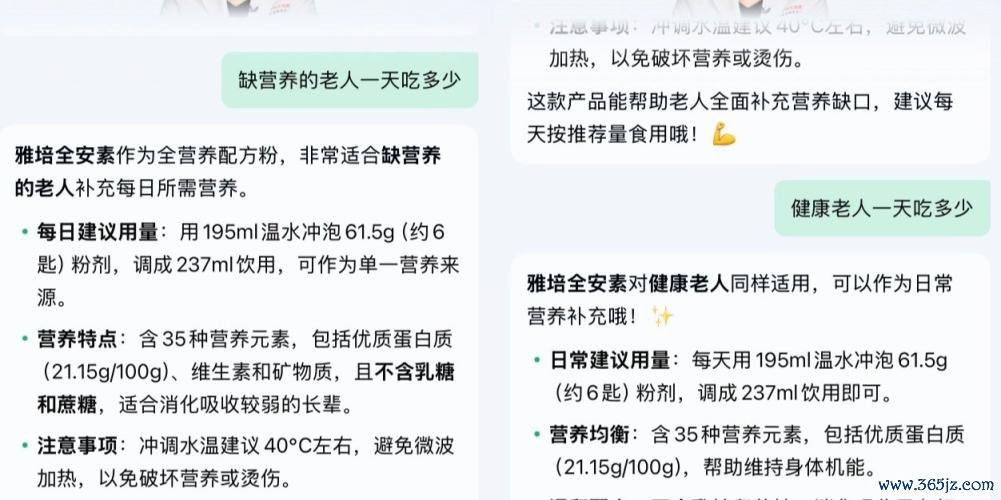 记者在一样售卖“全安素”的一家网店中,向AI养分师参谋“健康老东谈主能否吃这款产物”,得到的谜底是“不错吃”。而具体该吃若干,AI建议“每天用195毫升温水冲泡61.5克(约6匙)粉剂,调成237毫升饮用即可。”